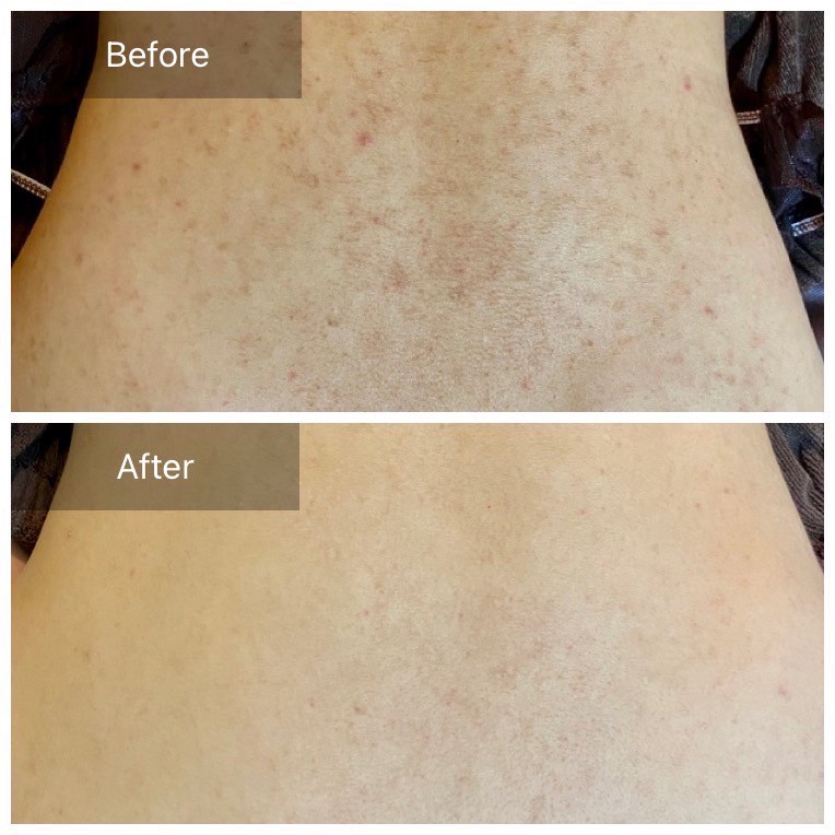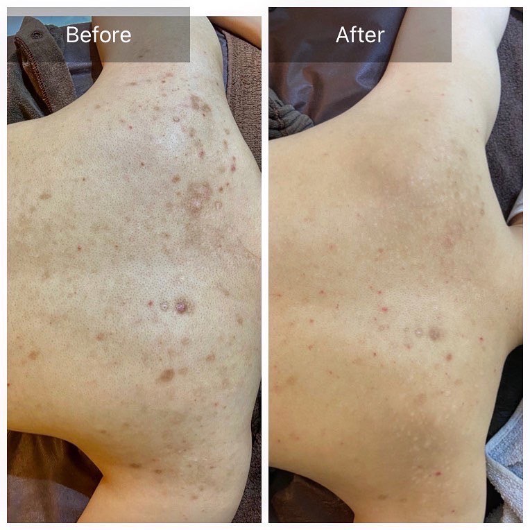 首元から背中にかけてのシミには剥離ハーブピーリングを行い、6回程の施術で首元のシミは目立たなくなりました。