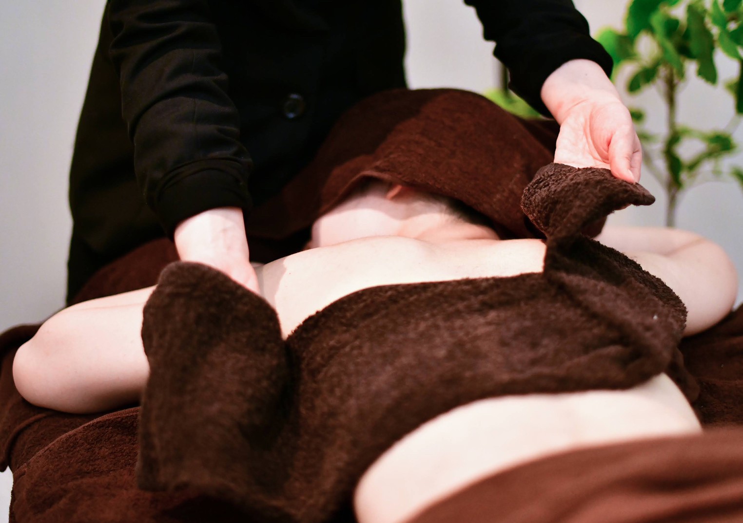 ハーブピーリングを終えたお肌を、温かいスポンジやタオルで包み優しく拭き取ります。