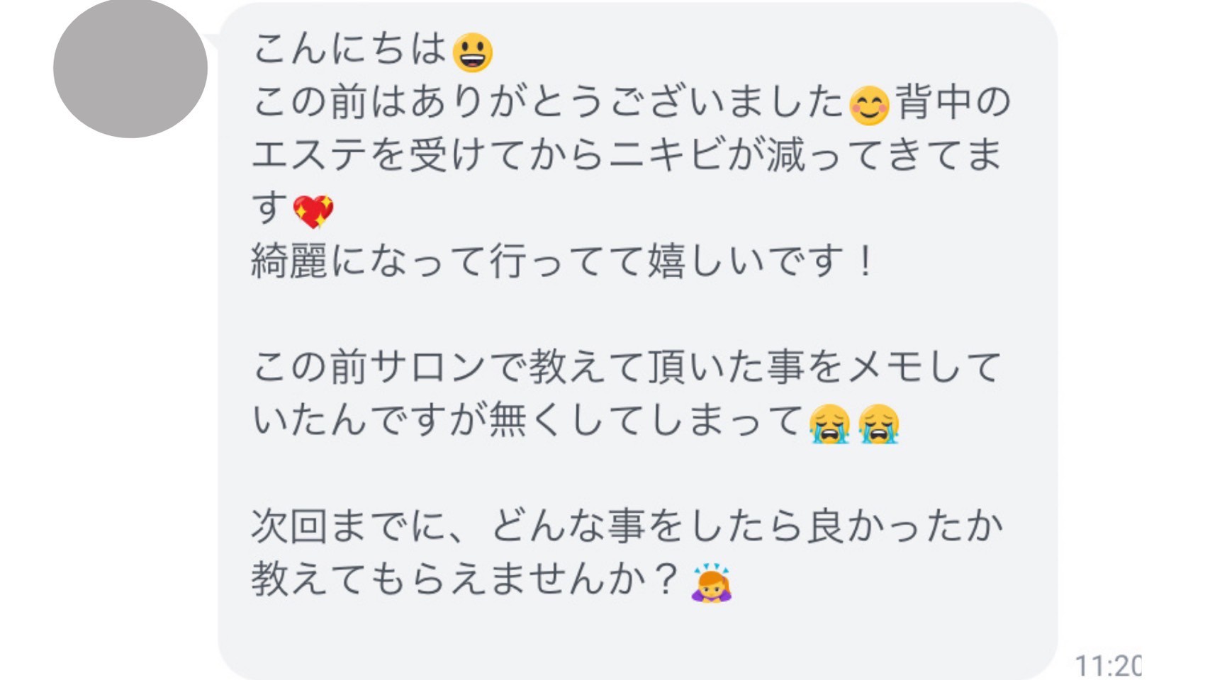| ご来店時のお悩み | 10代から繰り返す背中ニキビ、ニキビ跡 |